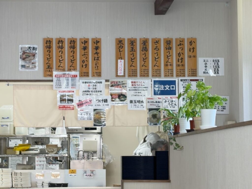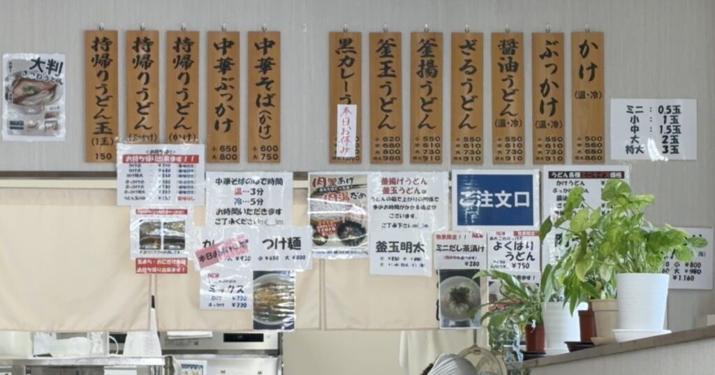 入り口から入ってすぐの壁に沿って右に向かって歩み、カウンターで注文して、カウンターでうどんを受け取ります。